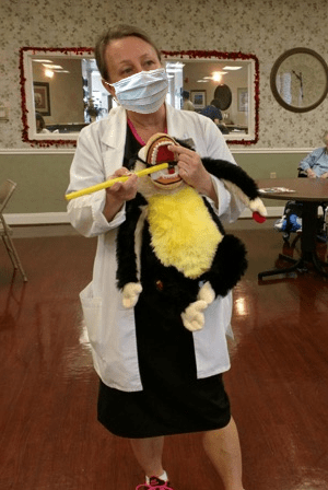 Michelle and Mojo provide in-service hygiene presentations for both residents and staff as requested from the facility. Our hygienist explains the importance of hygiene and discusses bacteria that contribute to poor oral health, etc. Michelle allows and urges residents to practice brushing with Mojo the Monkey.